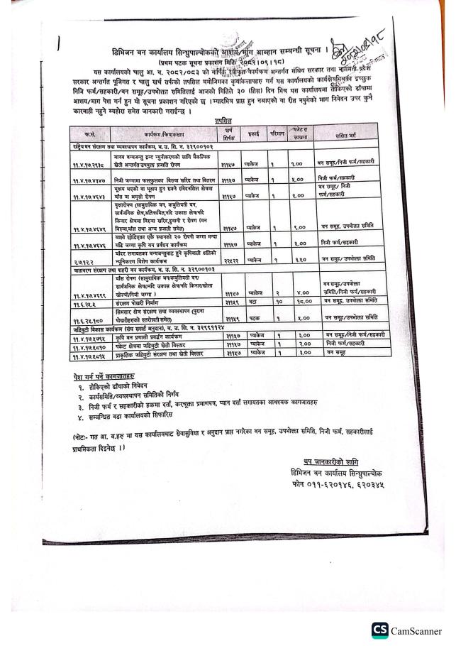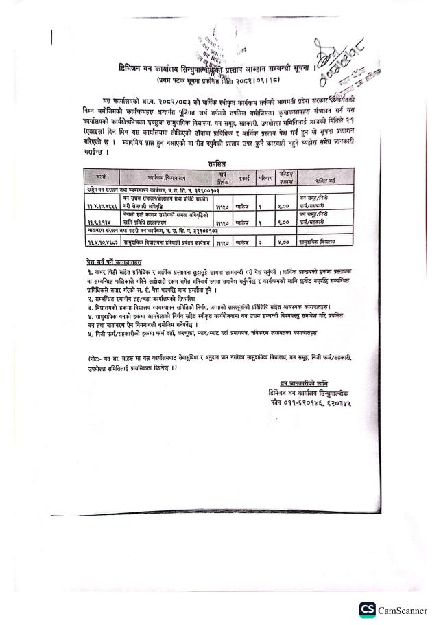 डिभिजन वन कार्यालय, सिन्धुपाल्चोकको प्रस्ताव आव्हान सम्बन्धी सूचना !!!