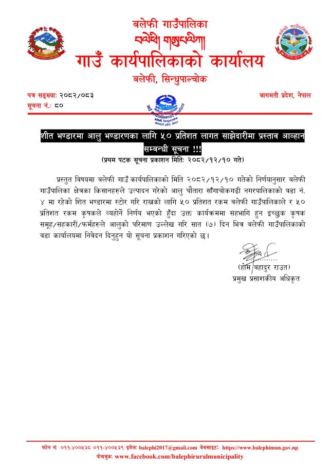 शीत भण्डारमा आलु भण्डारणका लागि ५० प्रतिशत लागत साझेदारीमा प्रस्ताव आव्हान सम्बन्धी सूचना !!!