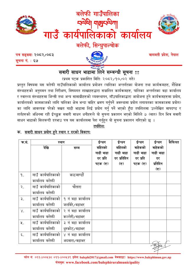 सवारी साधन भाडामा लिने सम्बन्धी सूचना !!!