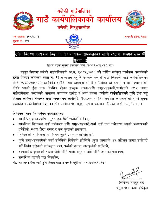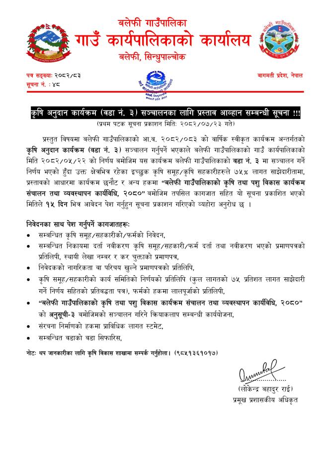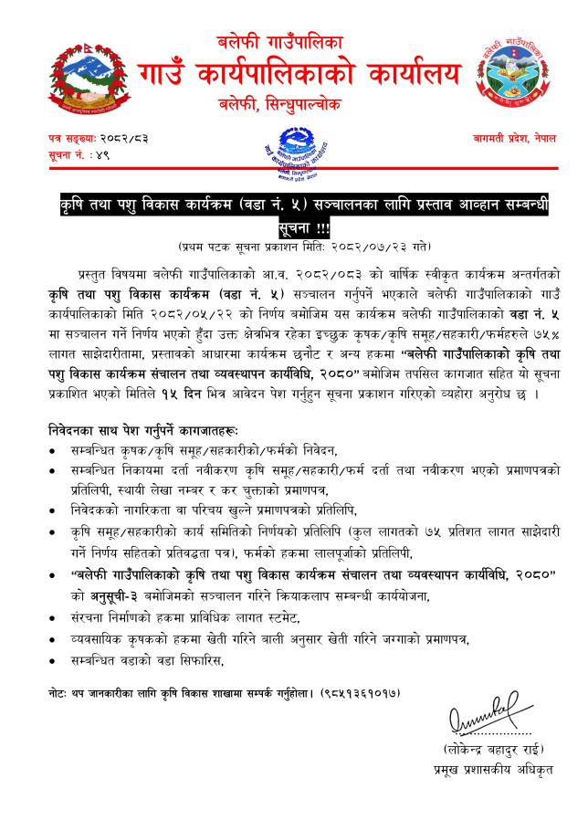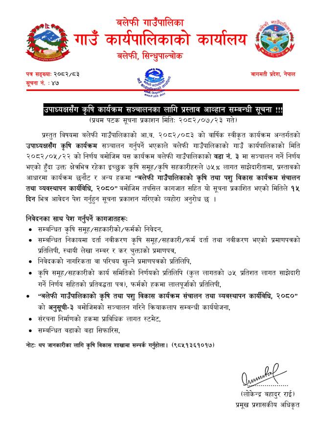 कृषि विकास शाखाबाट संचालन हुने कार्यक्रमको प्रस्ताव आव्हान सम्बन्धी सूचना !!!