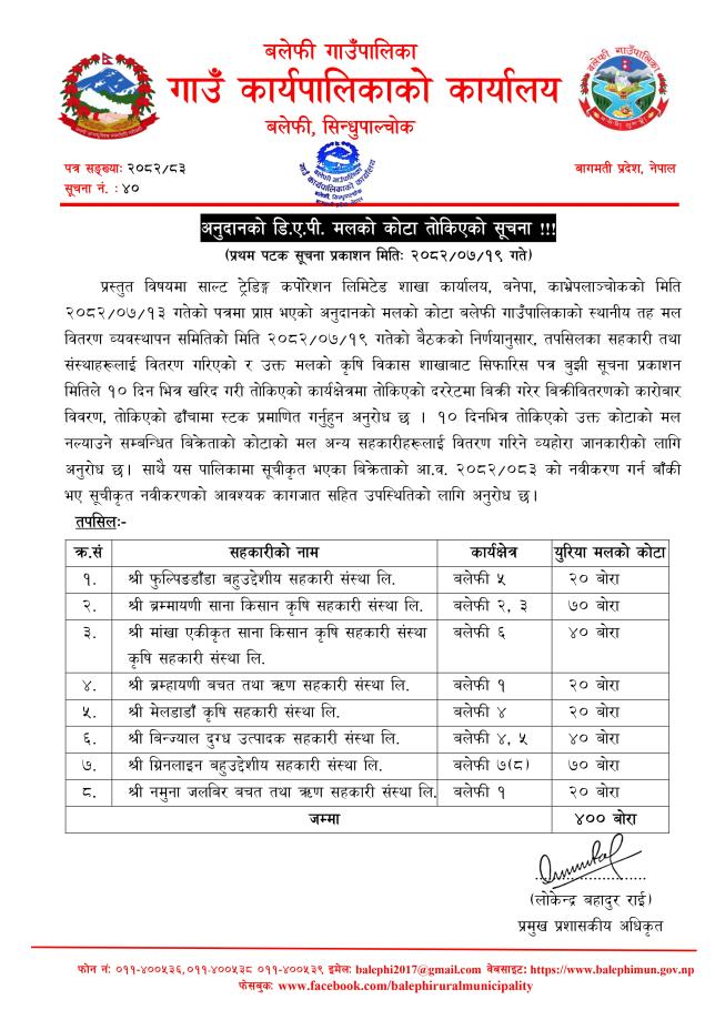 अनुदानको डि.ए.पी. मलको कोटा तोकिएको सूचना !!!