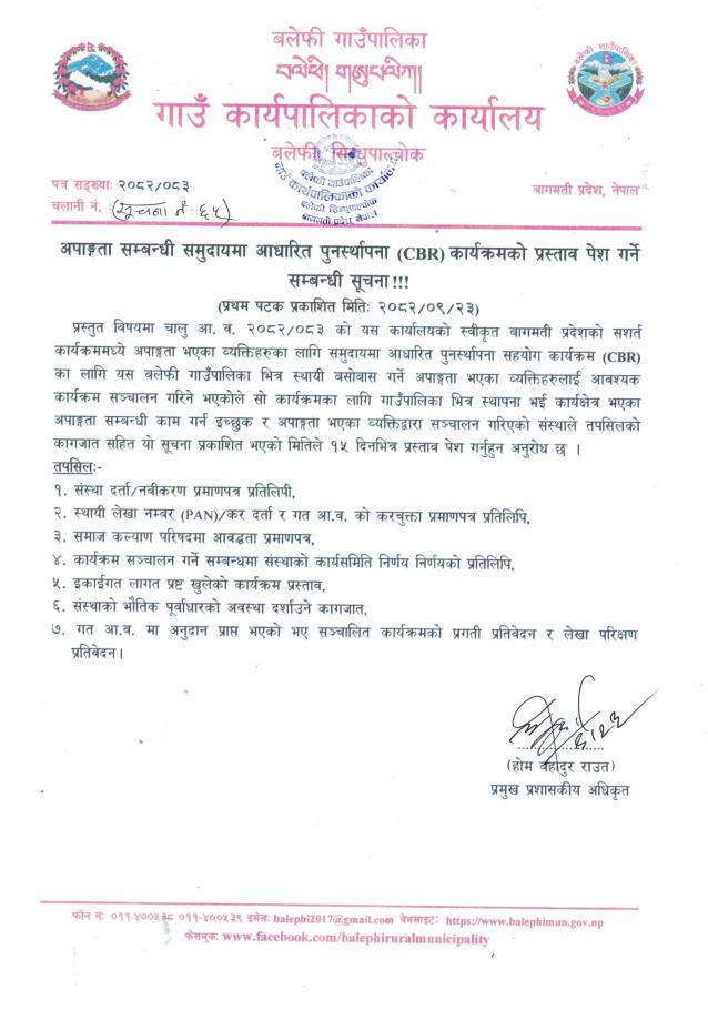 अपाङ्गता सम्बन्धी समुदायमा आधारित पुनर्स्थापना (CBR) कार्यक्रमको प्रस्ताव पेश गर्ने सम्बन्धी सूचना !!!