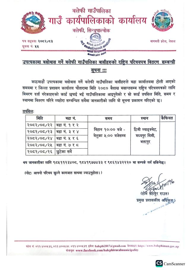 उपत्यकामा बसोबास गर्ने बलेफी गाउँपालिका बासीहरुको राष्ट्रिय परिचयपत्र वितरण सम्बन्धी सूचना !!!