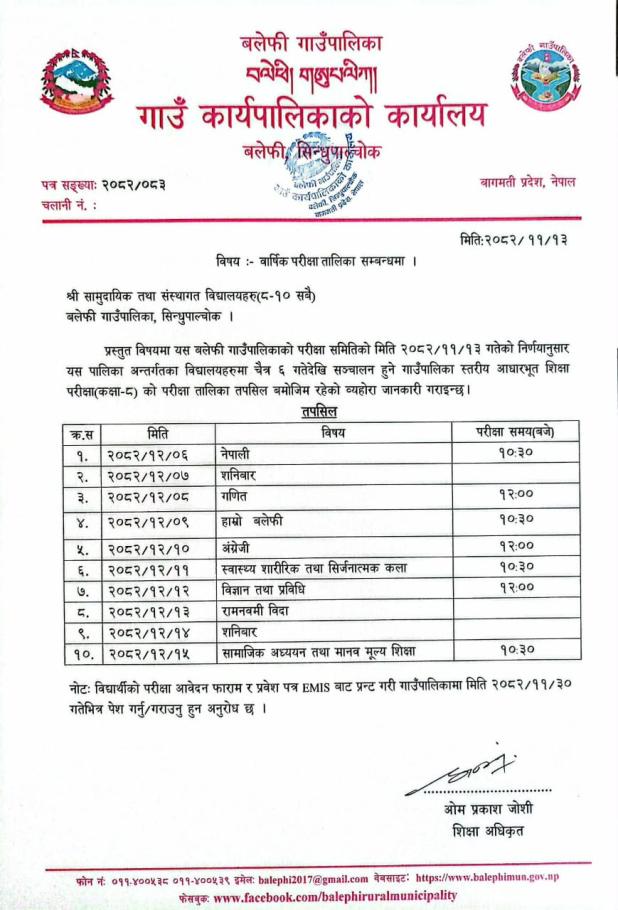 गाउँपालिका स्तरीय आधारभूत शिक्षा परीक्षा (कक्षा - ८) को तालिका प्रकाशन गरिएको सूचना !!!