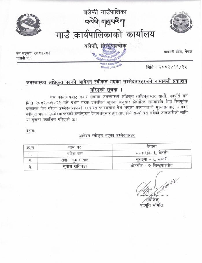 जनस्वास्थ्य अधिकृत पदको आवेदन स्वीकृत भएका उम्मेदवारहरूको नामावली प्रकाशन गरिएको सूचना !!!