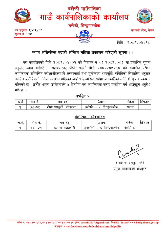 ल्याब असिस्टेन्ट पदको अन्तिम नतिजा प्रकाशन गरिएको सूचना !!!