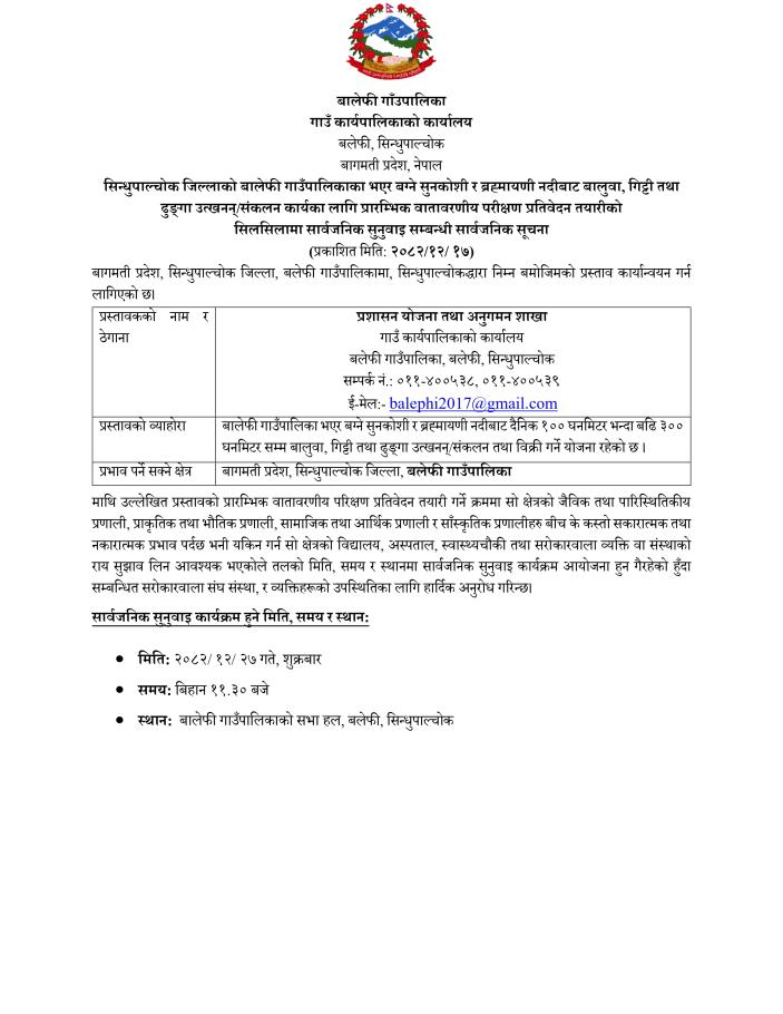 Home » सिन्धुपाल्चोक जिल्लाको बलेफी गाउँपालिकाका भएर बग्ने सुनकोशी र ब्रह्मायणी नदीबाट बालुवा, गिट्टी तथा ढुंगा उत्खनन् संकलन कार्यका लागि प्रारम्भिक वातावरणीय परीक्षण प्रतिवेदन तयारीको सिलसिलामा सार्वजनिक सुनुवाइ सम्बन्धी सार्वजनिक सूचना !!!