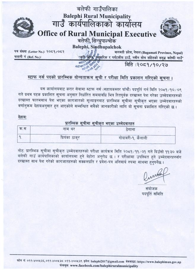 स्टाफ नर्स पदको प्रारम्भिक योग्यताक्रम सूची र परिक्षा मिति प्रकाशन गरिएको सूचना !