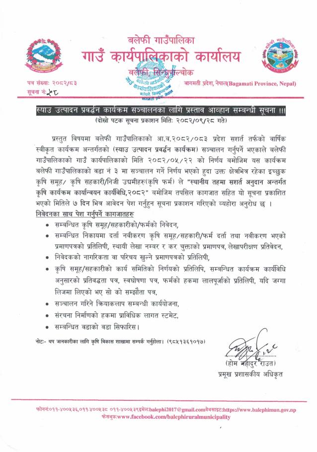 स्याउ उत्पादन प्रवर्द्धन कार्यक्रम सञ्चालनका लागि प्रस्ताव आव्हान सम्बन्धी सूचना !!! (दोश्रो पटक सूचना प्रकाशित मिति: २०८२/०९/२८)