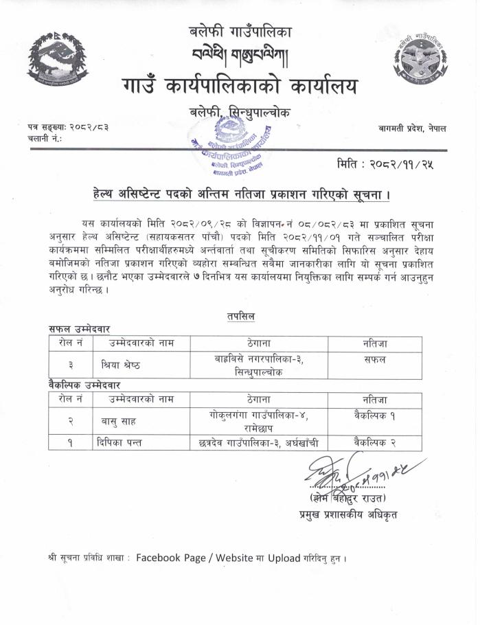 हेल्थ असिस्टेन्ट पदको अन्तिम नतिजा प्रकाशन गरिएको सूचना !!!